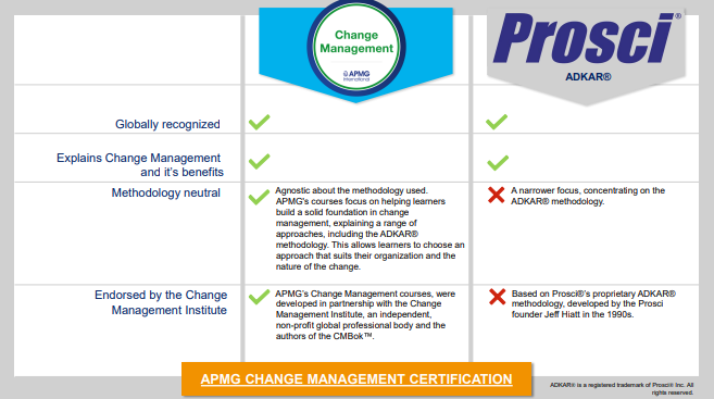 APMG offers a comprehensive catalog of change tools, while Prosci provides a single model in its ADKAR methodology. Newer practitioners may benefit from ADKAR’s structured approach and well-documented templates, which can build confidence when real-world experience is limited but will pay a premium to take this certification.